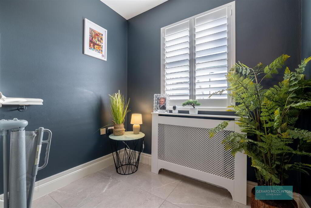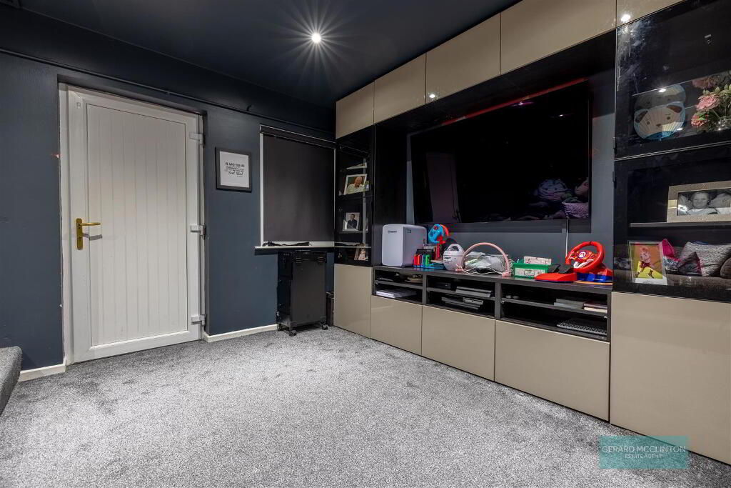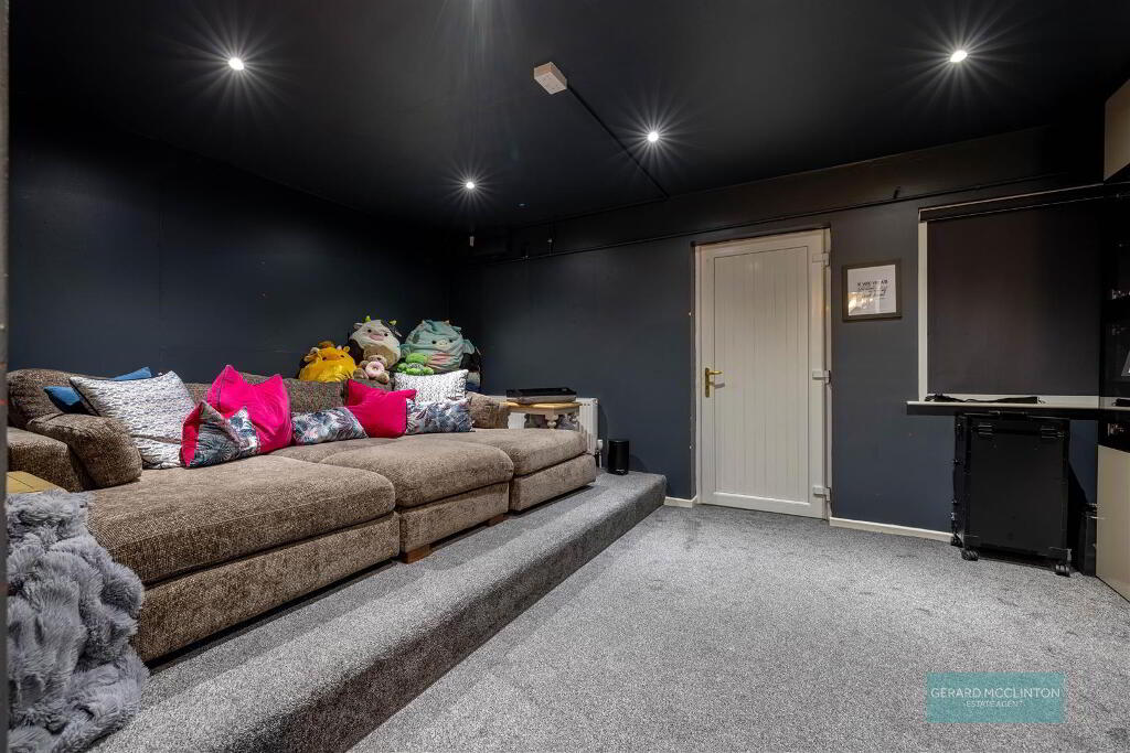 Previously the integral garage, the owners floored and insulated this room and created a super cosy home cinema room. With raised seating area, ceiling mounted projector fittings this is a brilliant entertaining space. There is also a dedicated section behind the garage door for storage with ample shelving.