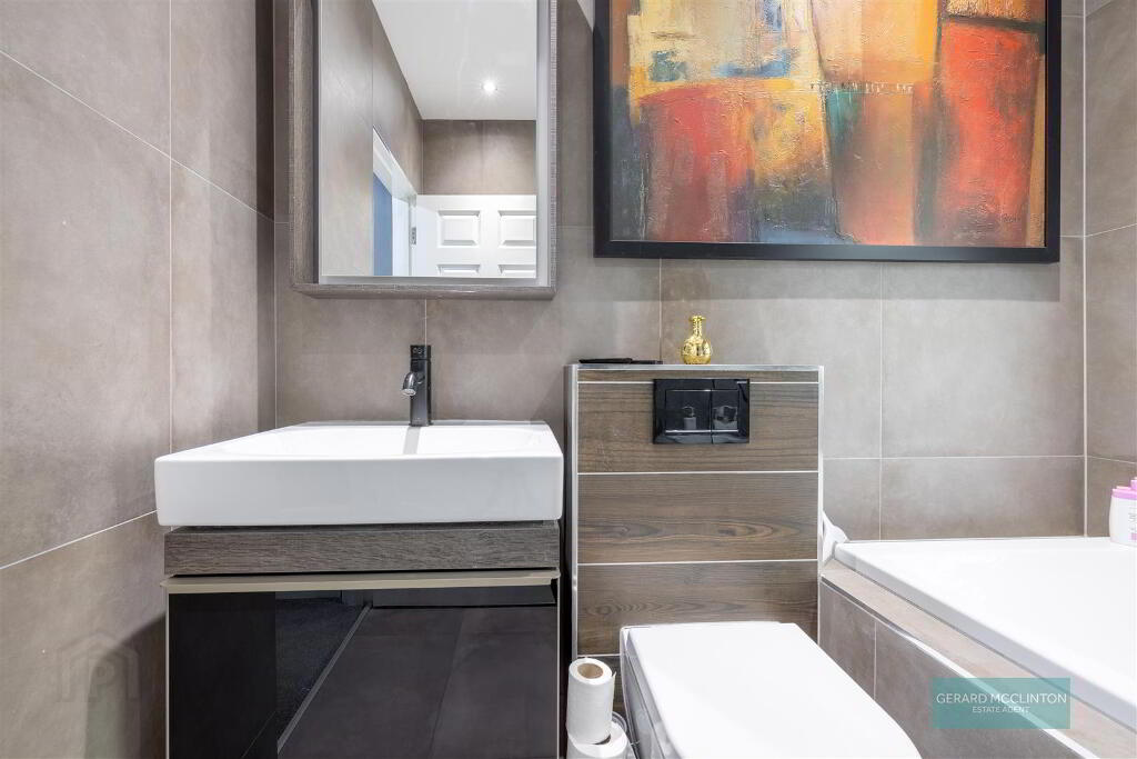 Double glazed Upvc window to rear, tiled floor, tiled walls, bath with central controls, shower screen and black shower over, enclosed cistern wc, wash hand basin with central mixer tap and vanity unit under, steam resistance wall mounted television