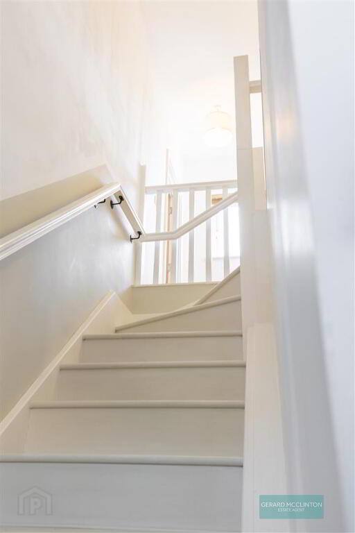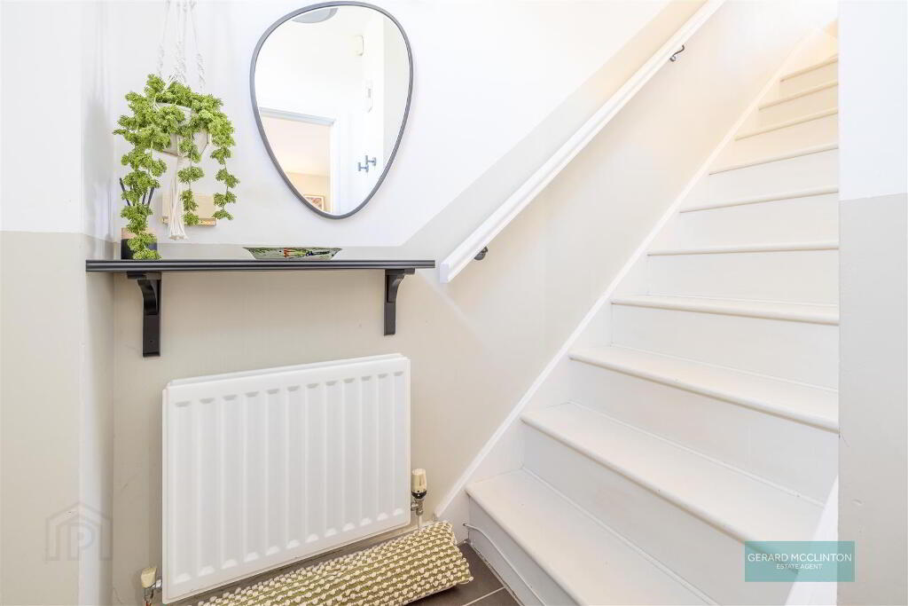 UPVC double glazed door to front, tiled floor, radiator, white painted staircase to 1st floor with two tone painted walls, glazed door to living room