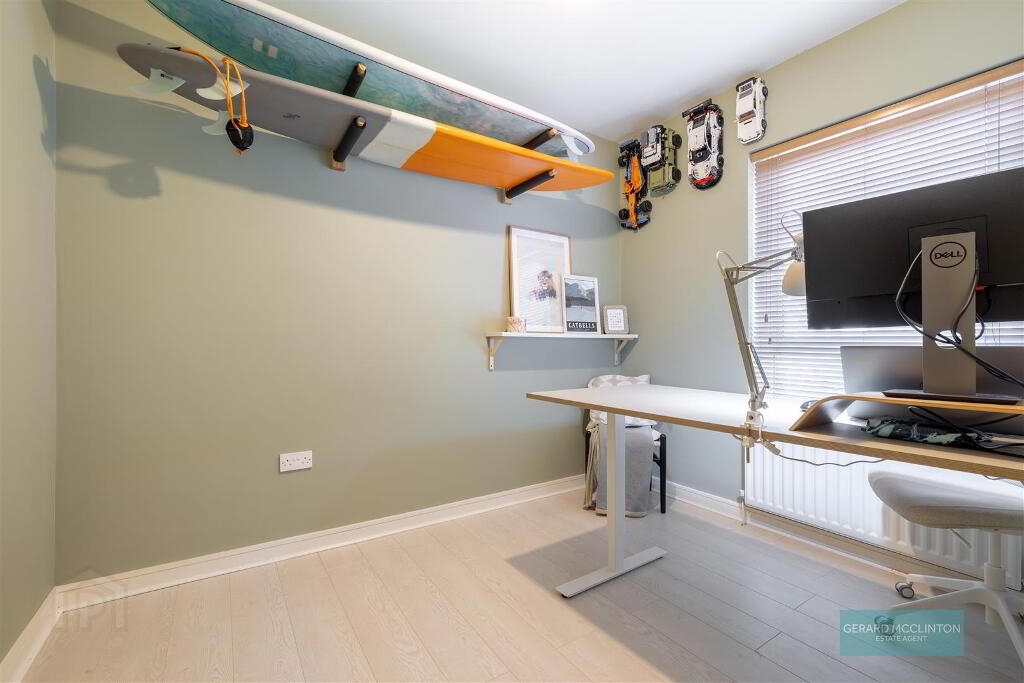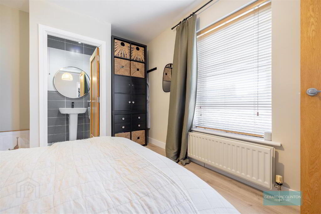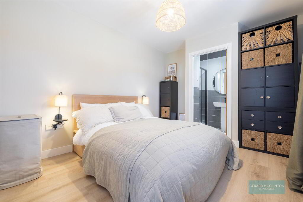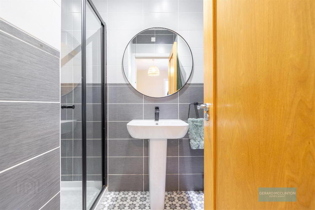 Upstairs, the home offers three well-proportioned bedrooms, including a generous principal bedroom with its own stylish en-suite shower room. A modern tiled family bathroom with white suite completes the first floor.