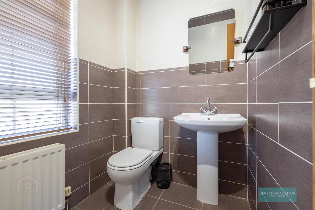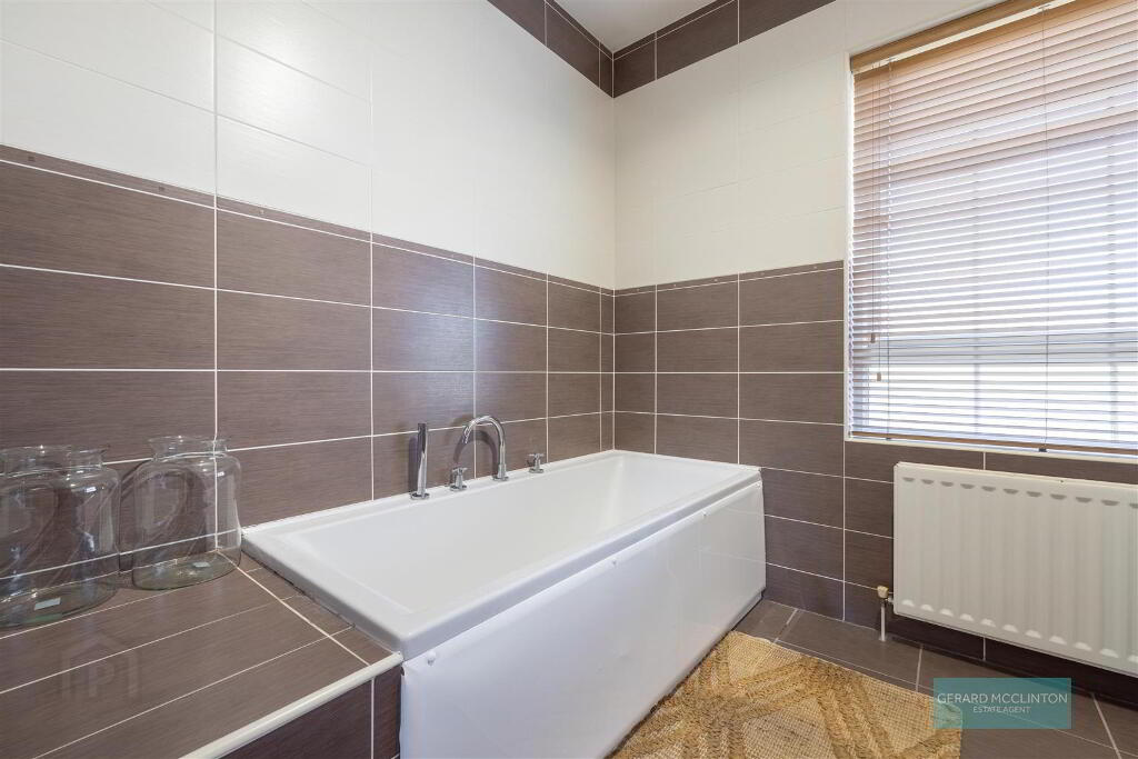 Double glazed window to front, radiator, tiled floor, tiled walls, pedestal white hand basin with mixer tap, close coupled WC, panelled bath with central mixer tap and hand shower