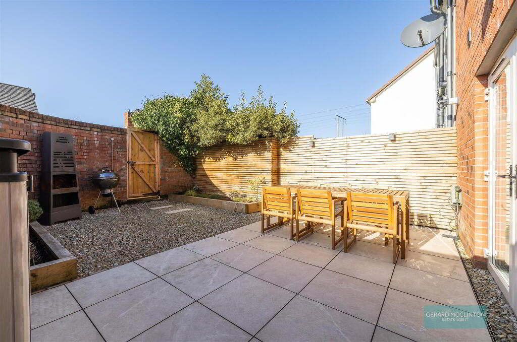 Rear garden, upgraded recently and comprising half tiled patio area with hidden slot drains, half decorative stone with two sleeper planters, pedestrian gate to residents car parking. Front garden laid with decorative stone.