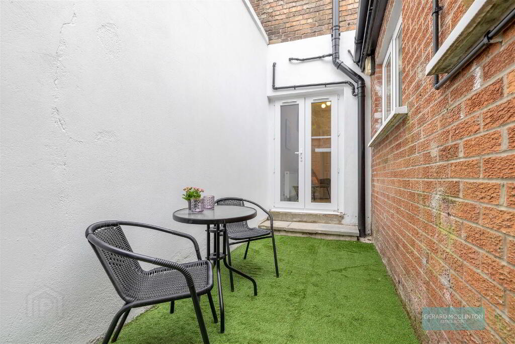 Outside to the rear is a low maintenance patio garden, with artificial lawn and newly repainted crisp white walls