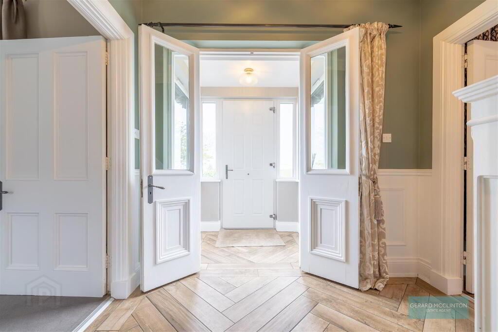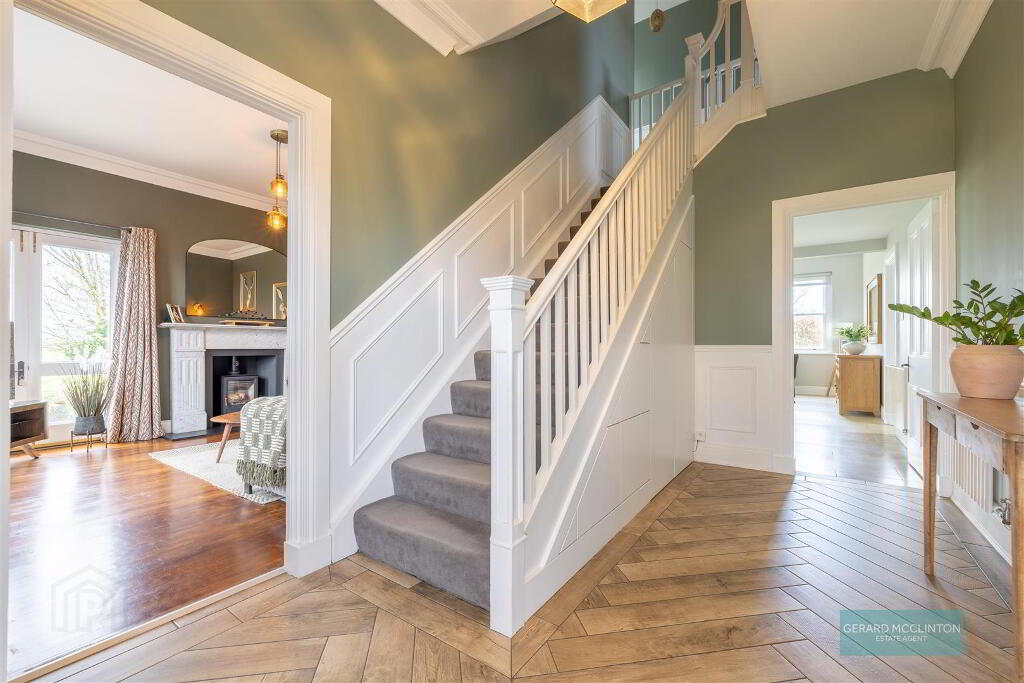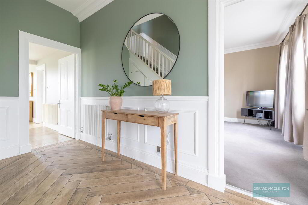 Impressive entrance hallway with double doors and finished to a high standard, creates a strong impression from the moment you step inside. The space is enhanced by bespoke half height wall panelling and a tasteful colour palette, complimented by a statement ceiling pendant. Under foot, high-quality wood effect porcelain tile flooring is laid in a herringbone pattern with a contrasting framed border adding a real sense of design and attention to detail. The staircase is finished with neutral carpet runner providing warmth and balanced to the space with the practical addition of discreet bespoke under stairs storage and a recently fitted designer radiator.