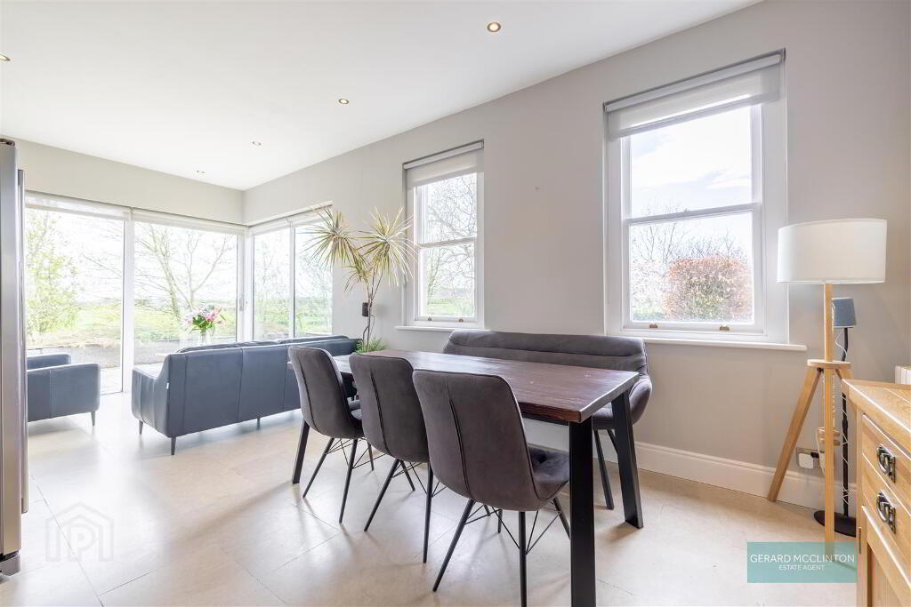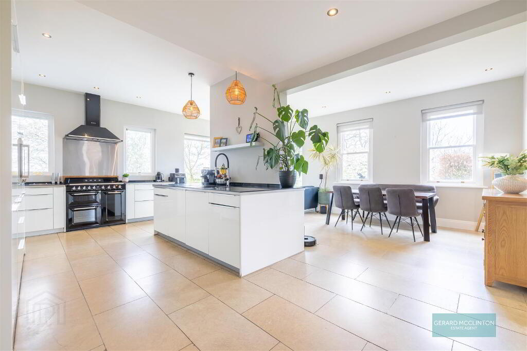 A feature range style cooker with stainless steel splashback and extractor creates a striking focal point, while integrated appliances and clean line cabinetry enhance the contemporary feel. The space flows seamlessly into a generous dining area easily accommodating a large table and ideal for both everyday use and hosting.