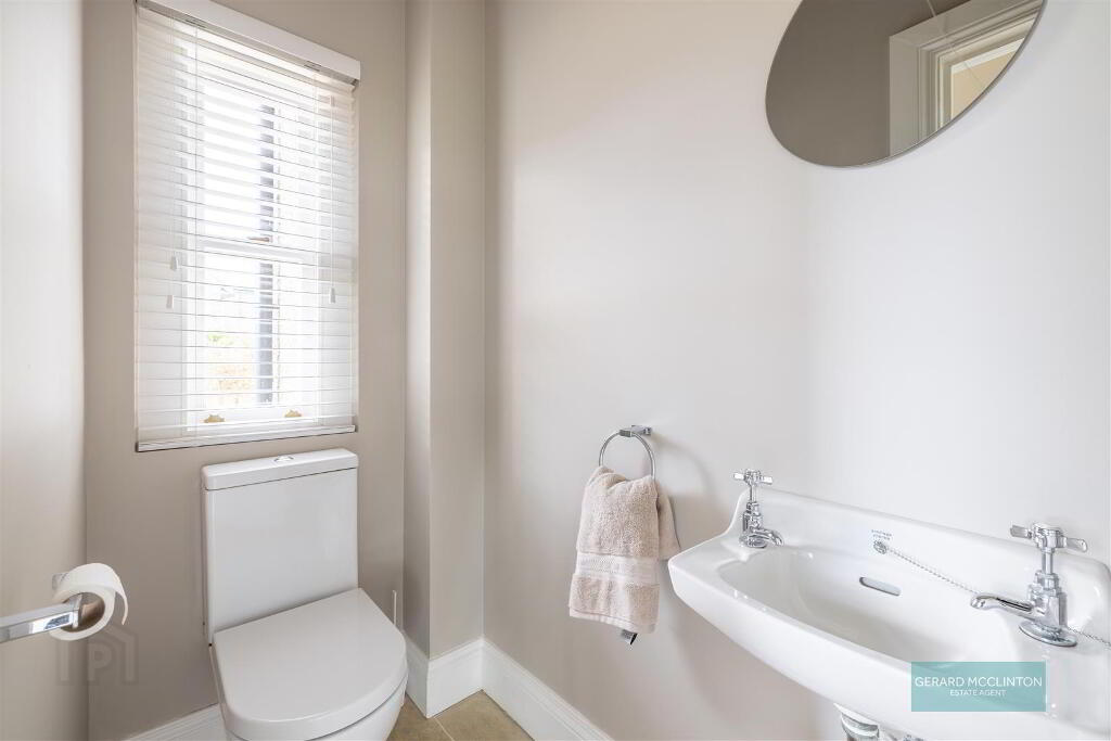 Practical ground floor WC comprising a modern white suite with wash hand basin and WC, tiled floor, double glazed sliding sash window to courtyard garden, contemporary vertical towel radiator
