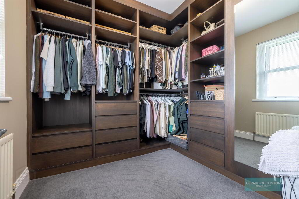 double glazed sliding/window to front, radiator, grey carpet, range of bespoke fitted robes, shelving and drawers