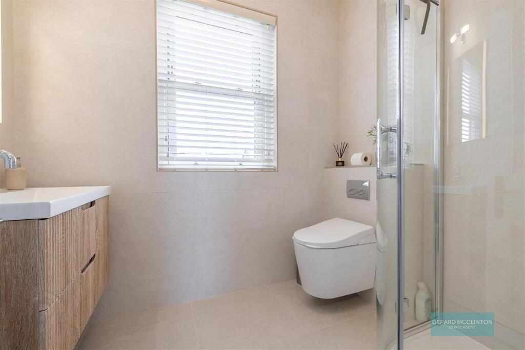 Contemporary suite comprising luxury remote control controlled bidet toilet, quadrant shower cubicle with thermostatic shower, rainfall shower head and hand attachment, accessories shelf with recessed lighting, modern white wash hand basin with fluted wood double drawer vanity unit, vertical heated towel rail, tiled floor and walls, wall mounted LED mirrored cabinet, double glazed sliding sash window to rear