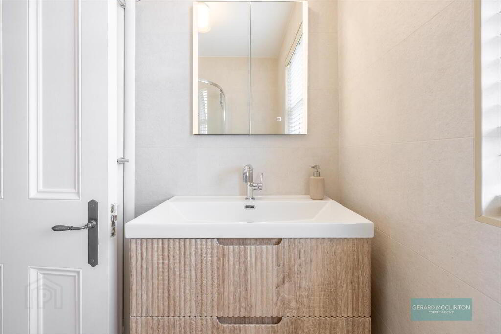1.773 x 1.745 double glazed sliding sash window to front, tiled floor, part tiled walls, contemporary white suite comprising close coupled WC, wash hand basin with mixer tap, shower cubicle with Mira sport electric shower, spotlights, extractor fan