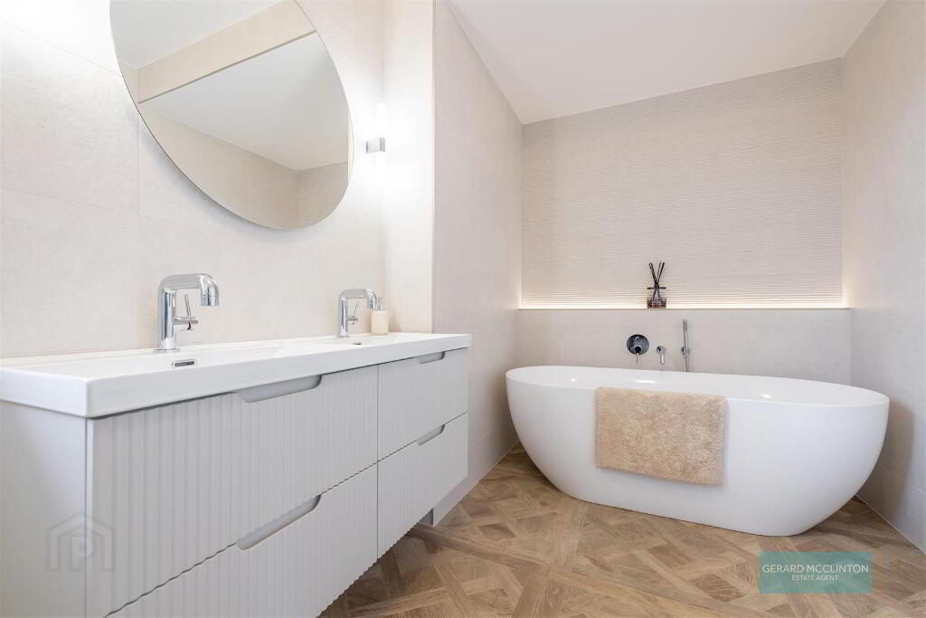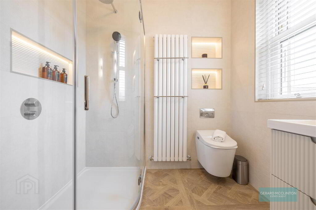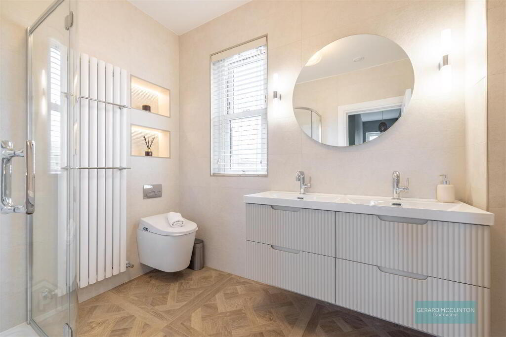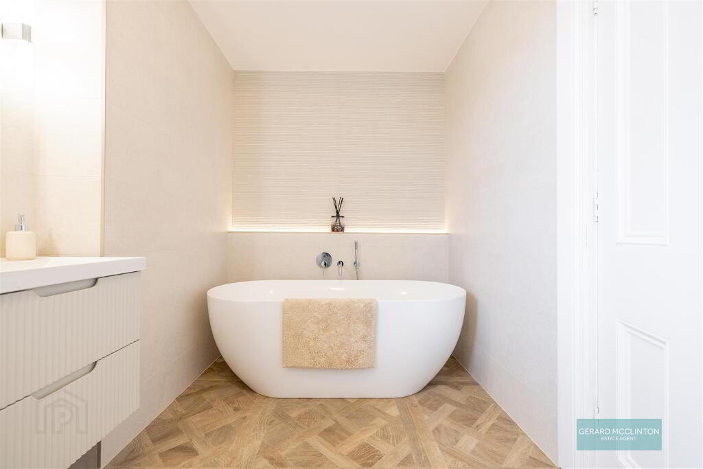 Stunning contemporary suite comprising, parquet style flooring, tiled walls, freestanding bath with central tap and hand shower, feature wall with recessed lighting, wall mounted LED mirror, contemporary vertical heated towel rail, quadrant shower enclosure with thermostatic shower, rainfall style shower head and separate hand shower, feature shelving with recessed lighting, luxury remote controlled toilet bidet, underfloor heating, UPVC sliding sash window to side
