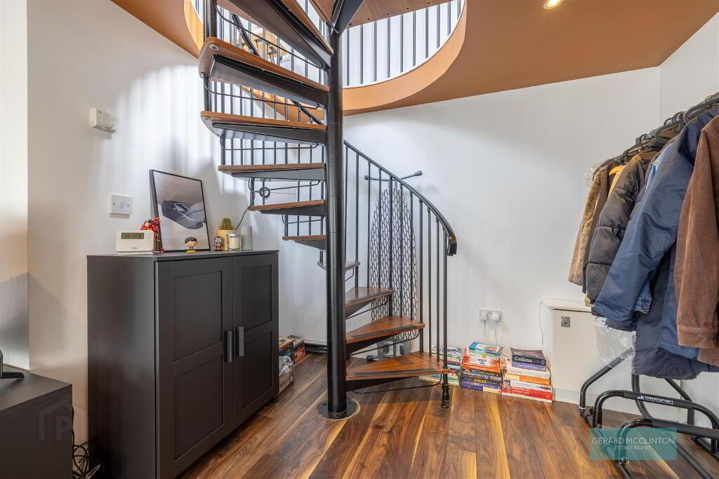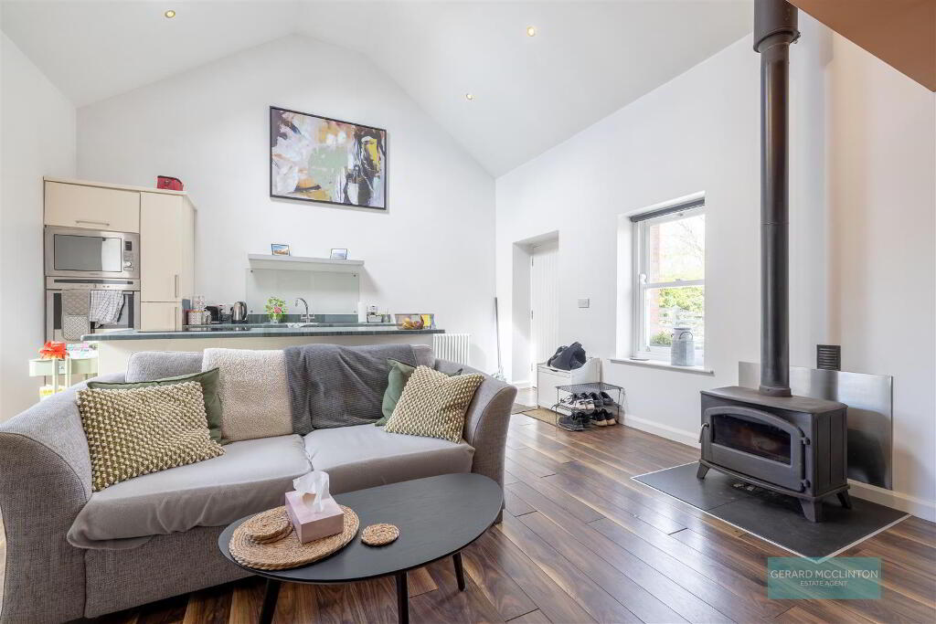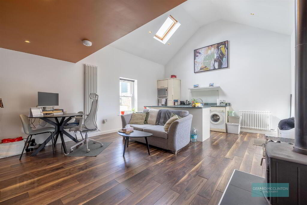 Composite entrance door, laminate wooden floor, double glazed sliding sash windows to front and rear, roof ceiling window, woodburning stove, vertical and horizontal radiators, fitted kitchen with range of high gloss cream units and stone effect worktops. Single drainer sink unit with mixer tap integrated dishwasher, integrated oven and Combi microwave oven, integrated induction four ring electric hob, space and plumbed for washing machine.