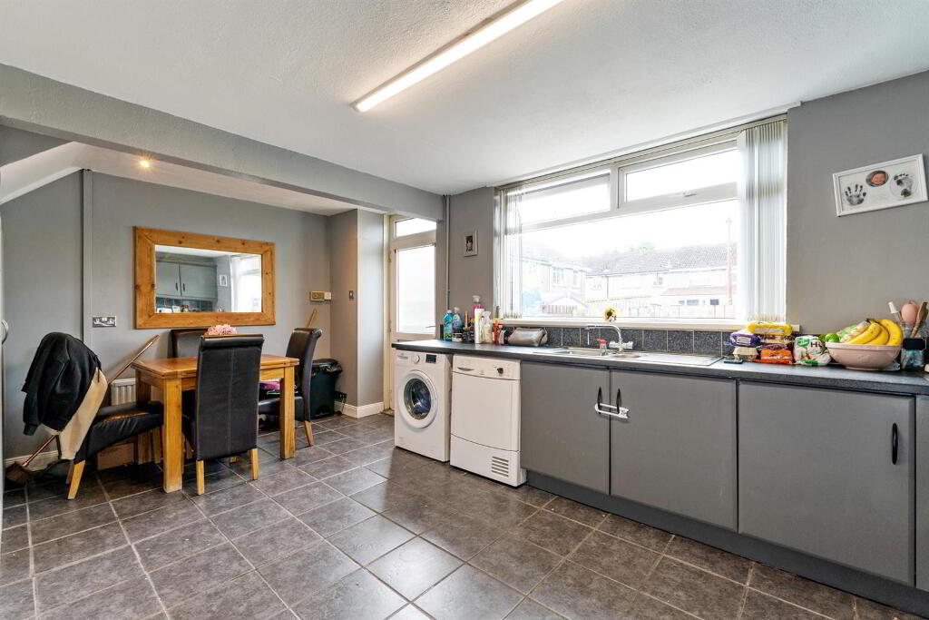 - Upvc double glazed window and door to rear, range of high and low level grey units, single drainer sink unit with mixer tap, space for washing machine, tumble dryer, cooker and fridge freezer