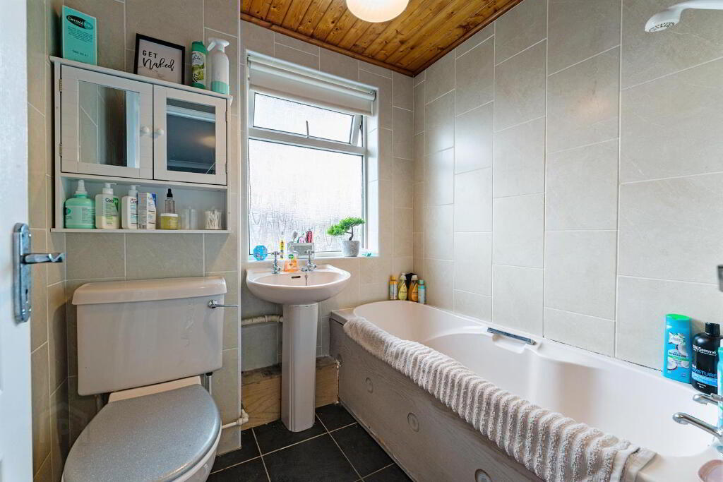 - Upvc double glazed window to rear, radiator, tiled floor, tiled walls, low flush wc, panelled bath with electric shower over, pedestal wash hand basin