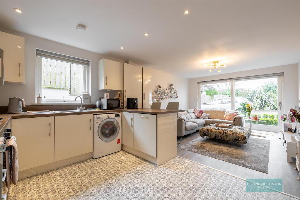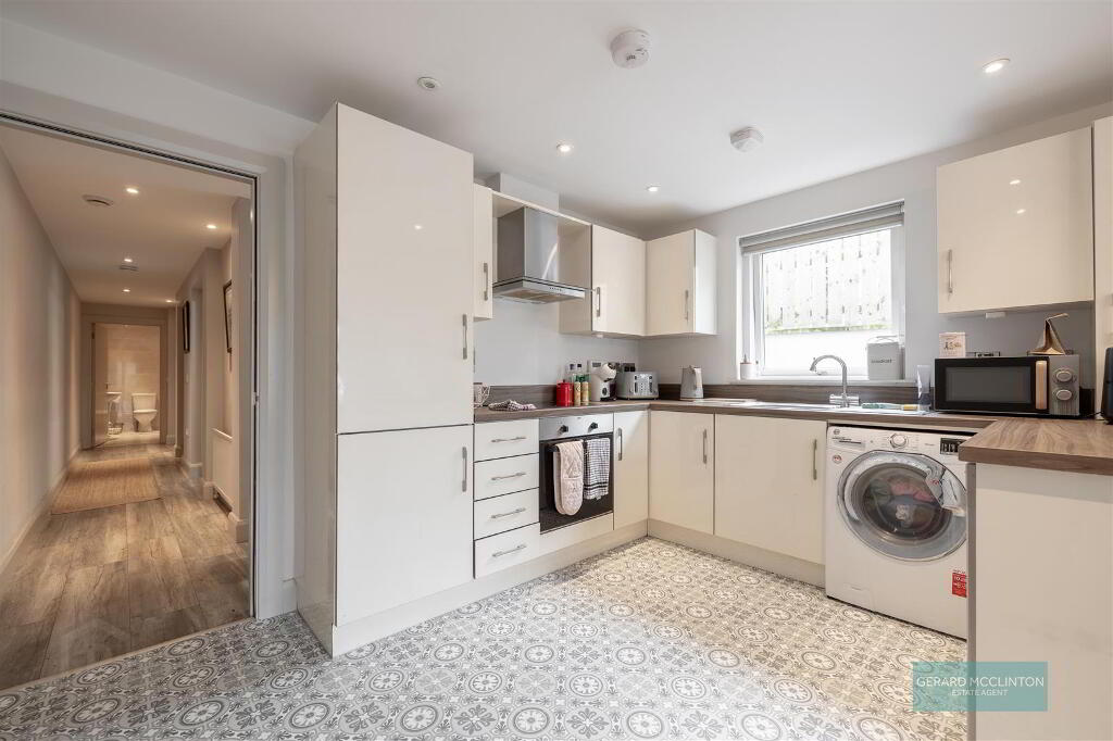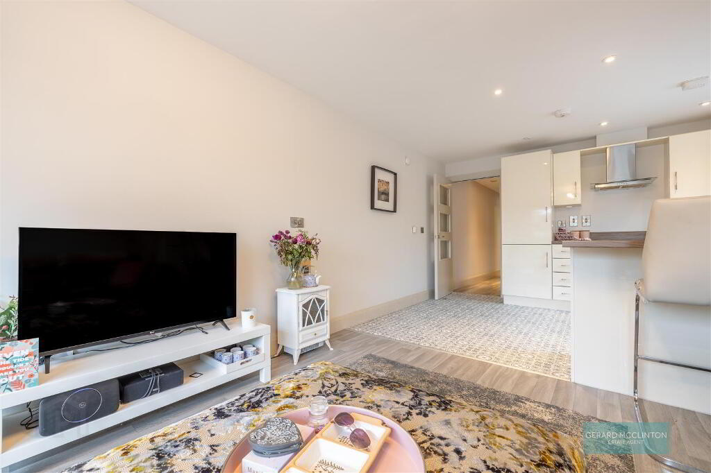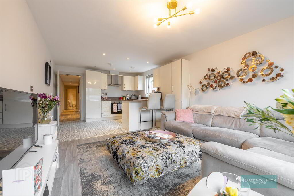 Built approx 2017 the apartment is a modern build with a contemporary finish. The accommodation comprises two bedrooms, the master bedroom is extremely generous in size and both have high level television points. The bathroom is contemporary and offers a white suite with P shaped Shower Bath with thermostatic shower, a close coupled WC and wash hand basin. The beautiful open plan living, dining area opens on to the kitchen, this room offers an abundance of light and the feeling of space. The open plan layout makes this area perfect for entertaining. The large double doors open onto the rear of the building and overlook the allocated car parking spaces for this property.
