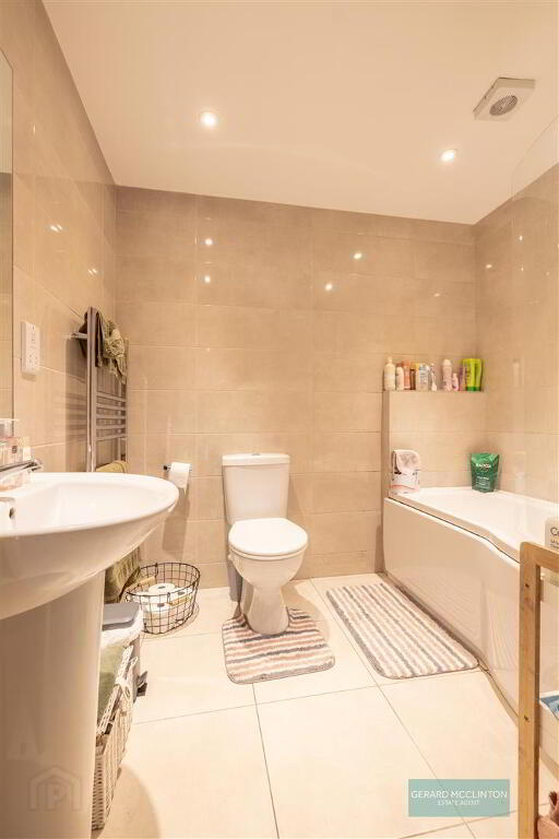 Tiled floor, tiled walls, modern white suite comprising wash hand basin with mixer tap, close coupled wc, P shaped bath with thermostatic shower, extractor fan, spotlights
